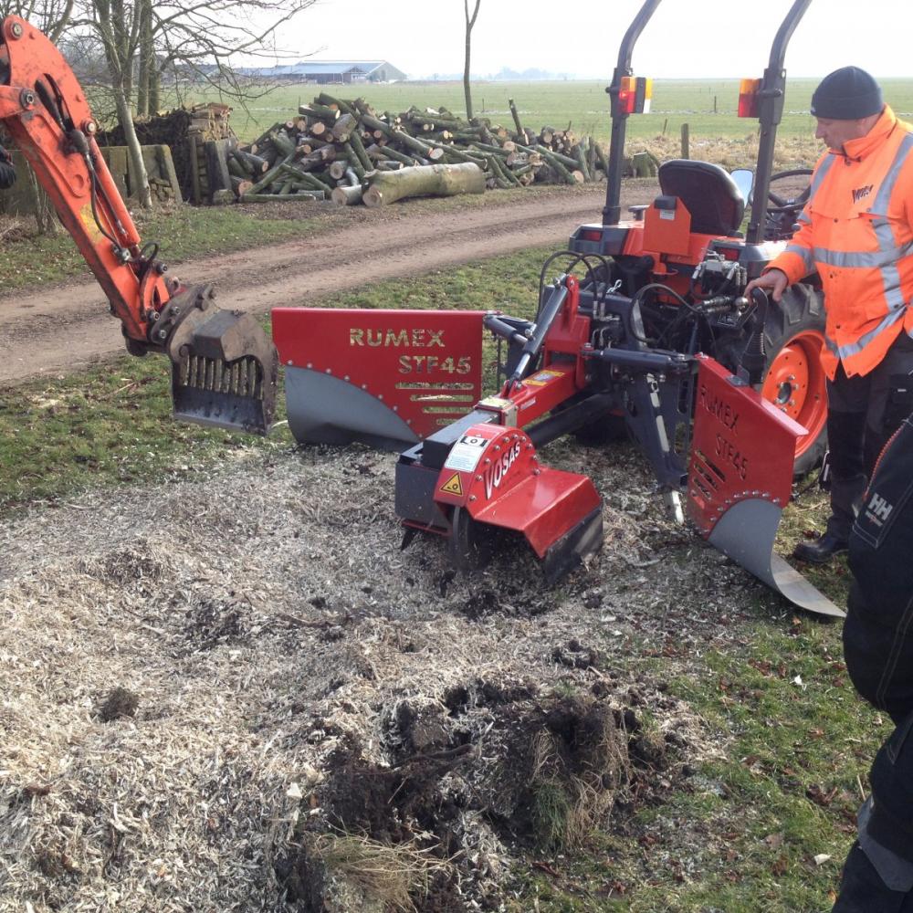 De Rumex Pro STF 450 aftakas-aangedreven stobbenfrees is speciaal ontworpen voor compacttractoren van 25 tot 50 pk. Deze frees is hydraulisch aangestuurd en voorzien van een 500 mm uitschuifbare arm. De STF 450 is zwenkbaar naar links, rechts, boven en beneden.